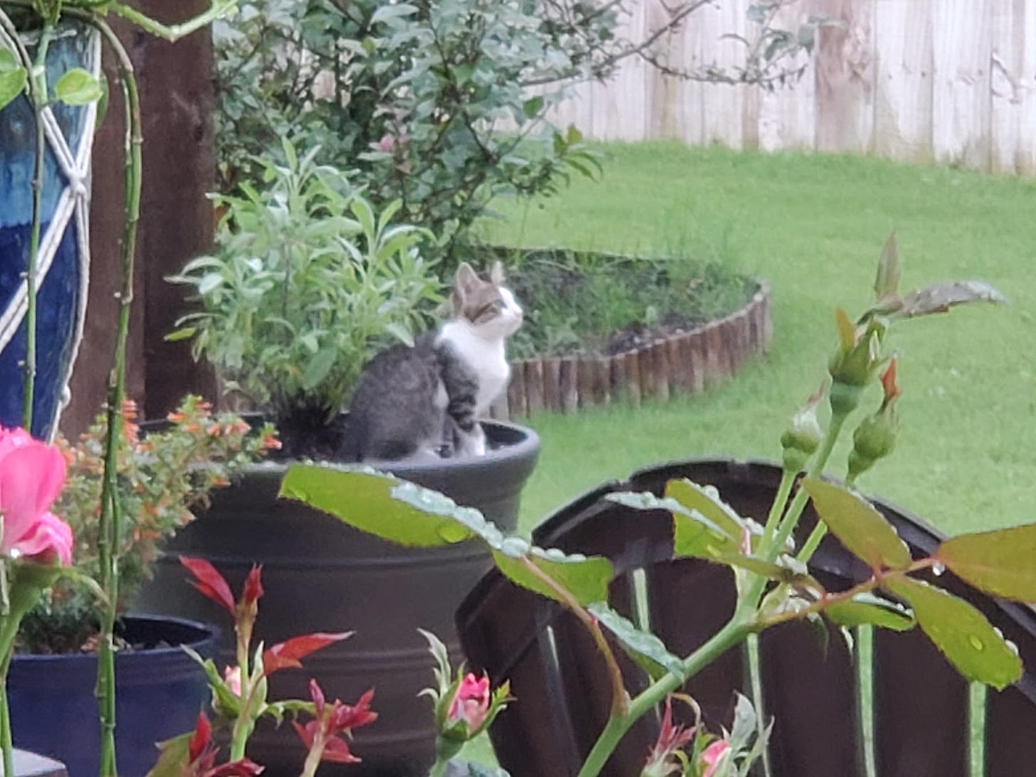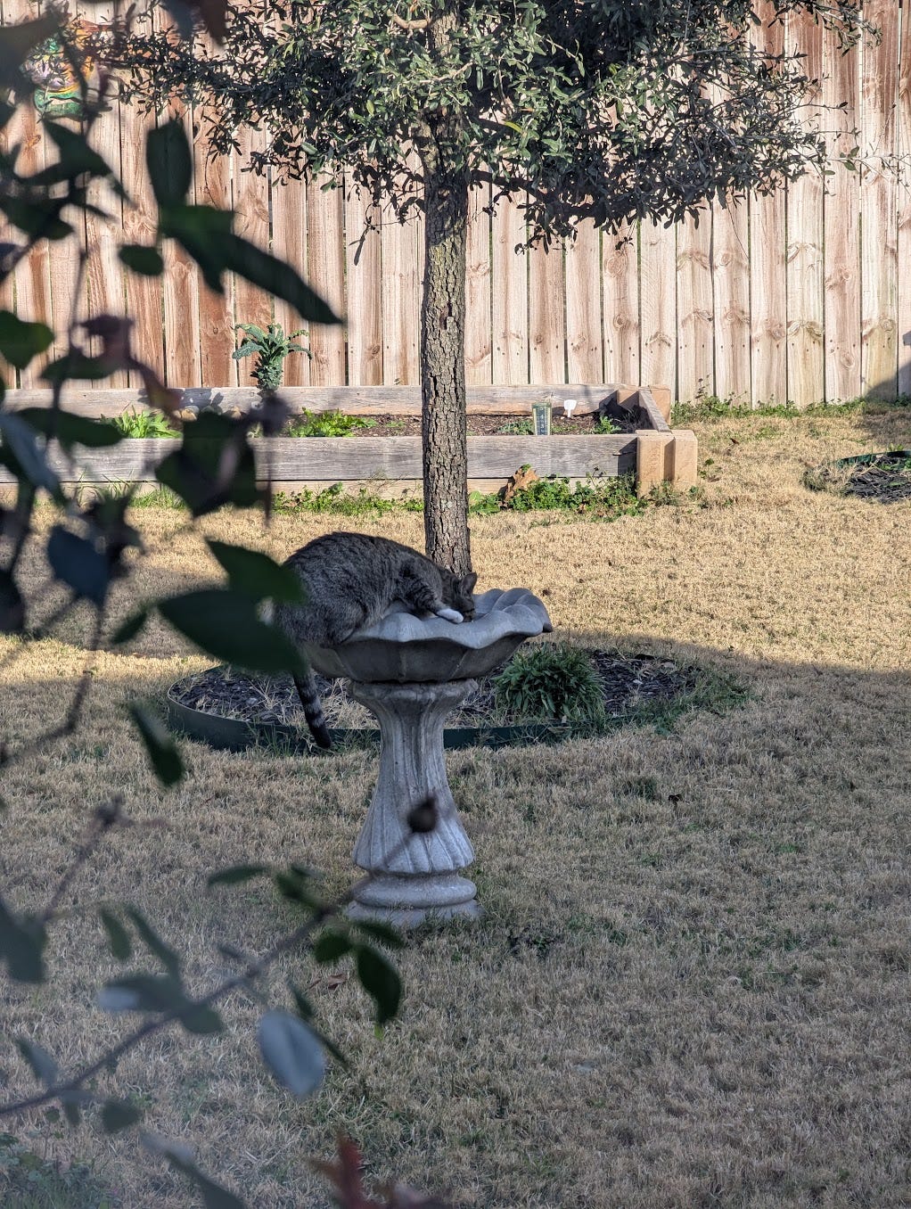 I just spent a couple of hours cleaning out the raised bed. Pulling weed, adding soil, all that. Planting will commence tomorrow. I also started pruning the roses we inherited with the house. Those things are amazing! They get up to about 5’ tall and cover the back windows.